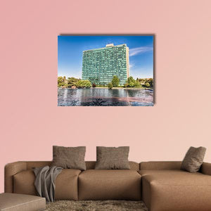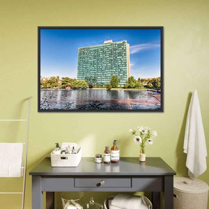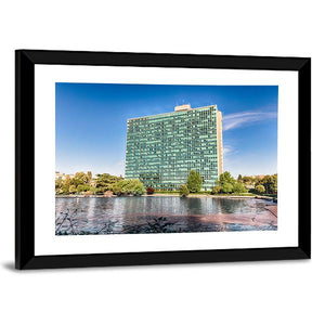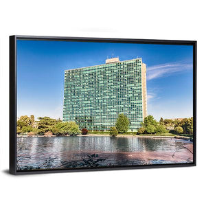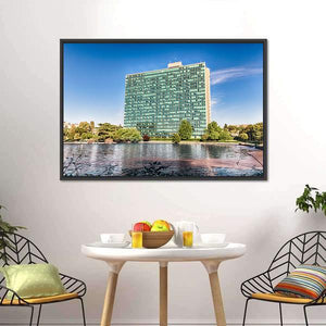 ENI Headquarters Canvas Wall Art depicts a modern glass-clad building centered above a calm lakeside, with trees and sky and the building’s windows reflected on the water. The bright, calm palette of green, blue, brown and gray gives the scene a serene, modern feel that suits modern interiors and room decor.