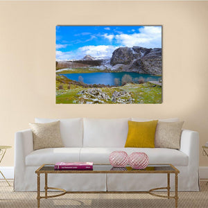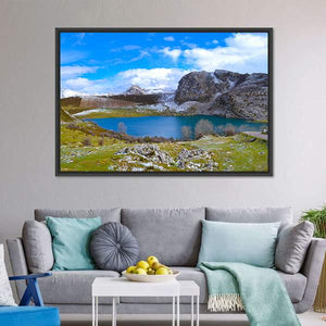 Capture the tranquil beauty of Enol Lake in Austria with this stunning landscape artwork. Featuring serene mountains and a clear blue sky, this piece brings a vast and cold feeling to your space, inviting reflections on nature's calm.