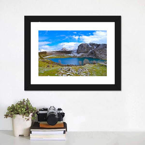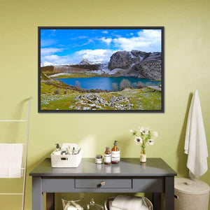 Enol Lake, Austria appears here as a realistic landscape: a calm lake framed by snow-dusted rocks, bare trees and distant mountains beneath a wide sky. Cool blues, greens and soft greys create a serene, majestic, and tranquil atmosphere. It suits modern or nature-inspired room decor as a calming wall focal point.