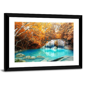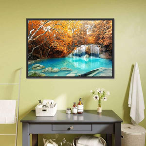 Bring the serene beauty of nature into your space with this vibrant depiction of Erawan Waterfall. Featuring a tranquil turquoise pool surrounded by autumn foliage and rocks, this artwork invites a peaceful atmosphere that complements any room.