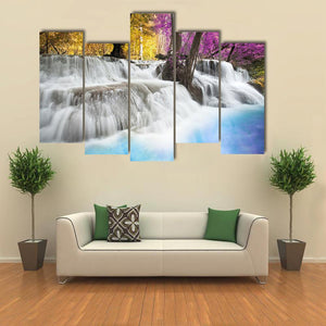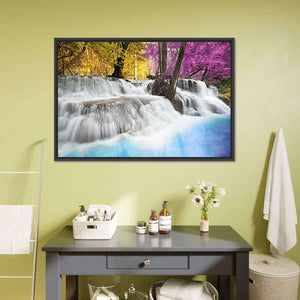 Erawan Waterfall in Kanchanaburi presents a vibrant, tranquil forest scene with a long-exposure waterfall and colorful foliage. The photograph’s depth and rule-of-thirds composition uses blue, green, white, yellow, and purple tones to create a serene, modern feel suitable for living rooms, bedrooms, or home offices.