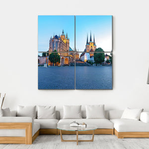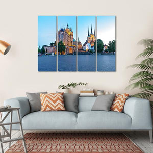 This canvas wall art features the stunning Erfurt Cathedral, showcasing its ornate gothic architecture set against a serene twilight sky. The rich palette of blue, gray, and yellow captures the historic essence of this beautiful cityscape.
