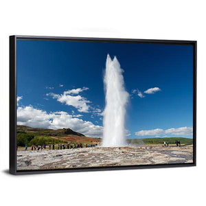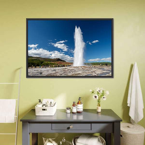 This striking canvas wall art captures a tall geyser erupting against a backdrop of green hills and brown mountains. The scene is filled with awe-inspiring natural beauty, enhanced by a bright blue sky dotted with fluffy white clouds.