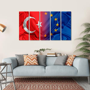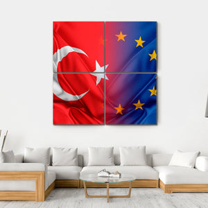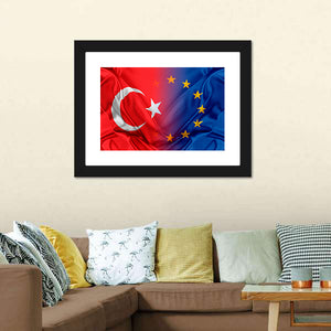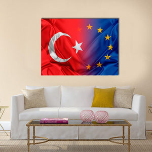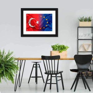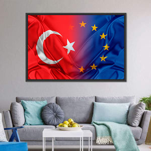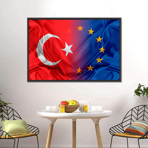 This canvas art features the flags of Turkey and the European Union, beautifully blended to evoke a sense of unity. The vibrant palette of red, blue, and gold captures a hopeful and symbolic mood, making it a striking addition to your wall decor.