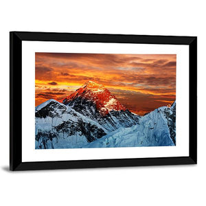 Colored View Of Everest presents a realistic landscape of Everest with snow-covered slopes, cloud-streaked sky and sunlight striking the summit at sunset. The red, orange and blue palette gives the scene a dramatic, majestic mood and makes the print well-suited to modern room decor.
