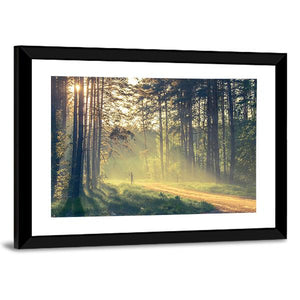 This artwork captures a serene forest path bathed in soft sunlight. The ethereal scene features sunbeams breaking through the mist, creating a peaceful atmosphere that invites reflection.