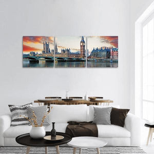 A photorealistic panoramic view of Big Ben (Elizabeth Tower), the Palace of Westminster and the River Thames. The blue, orange, grey and gold palette gives a serene, majestic sunset mood. Suits modern, city-themed rooms and wall decor.