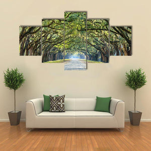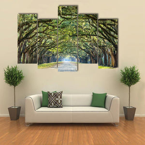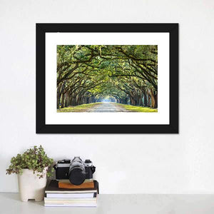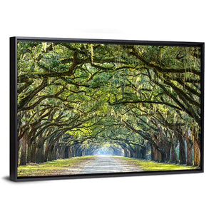 Wormsloe Tree Tunnel in Savannah, Georgia captures a tree-lined road of oak trees draped in Spanish moss with sunlight filtering through the leaves. Rendered in a realistic landscape style using greens, browns and soft grays, it evokes a peaceful, tranquil mood. Works well as calm wall decor in modern or nature-inspired rooms.
