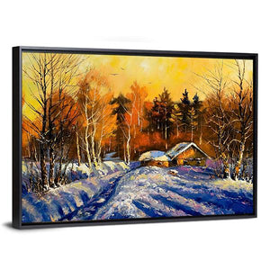 Evening In Winter Village captures a serene, cozy winter scene: a cabin tucked into a snowy forest with warm orange light filtering through the trees. Thick, impressionistic brushstrokes and a panoramic composition create a quiet, intimate mood. This nature-focused print suits living rooms or bedrooms that favor calm, understated wall art.