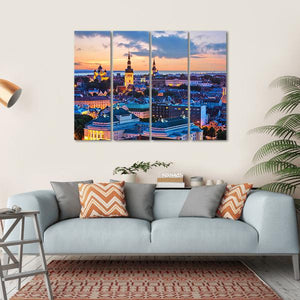 Experience the vibrant city skyline of Tallinn at dusk with this captivating canvas wall art. Featuring historic architecture, tall spires, and glowing windows under a dramatic twilight sky, this piece brings a warm and atmospheric touch to your décor.