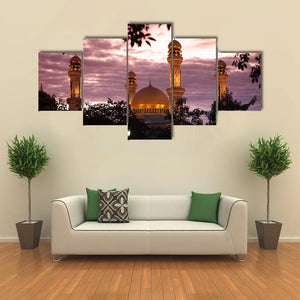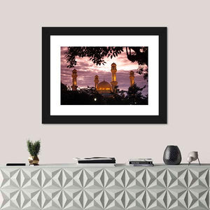 This landscape canvas showcases the striking beauty of the Jame Asr mosque, featuring ornate minarets and a majestic golden dome set against a serene evening sky. Its rich palette of gold, purple, and pink creates an atmospheric touch that fits well within modern decor.