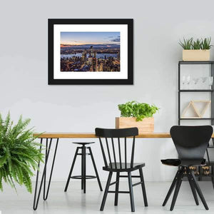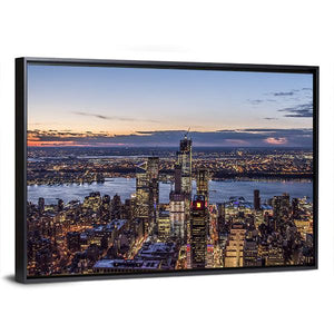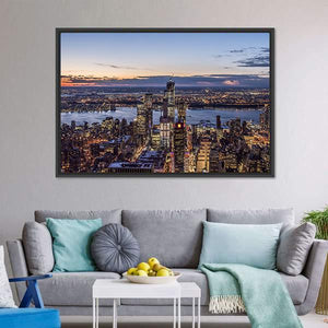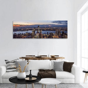 An evening view of the New York city skyline and river, captured in a panoramic canvas print. Cool blues with warm orange and purple dusk tones give the scene a calm, majestic urban mood. Its modern style works well in living rooms, offices, or entryways with contemporary decor.