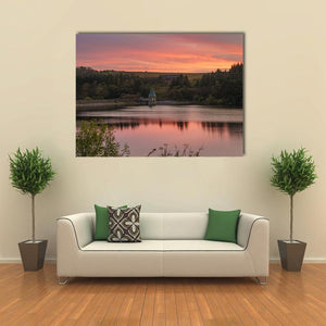 This landscape artwork captures a serene evening at Pontsticill Reservoir, featuring a tranquil lake surrounded by lush trees and a distinctive tower-like building. The calming palette of pink, orange, green, and blue makes it a beautiful addition to any modern decor.