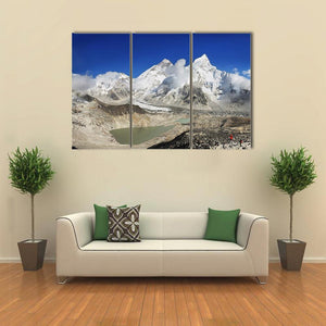 Everest And Lhotse Canvas Wall Art shows snow-capped peaks rising beyond a glacier-fed lake beneath a clear blue sky. The wide composition and cool blues, whites, greys, and touches of green convey a majestic, serene sense of scale. It fits well in modern homes and room decor as a calm, natural focal point.