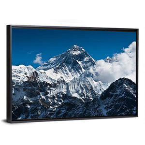 This canvas showcases the awe-inspiring Everest Mountain, capturing its majestic peak surrounded by snow and wispy clouds. The deep blue sky contrasts beautifully with the rugged mountain ridges, creating a breathtaking landscape for your wall.