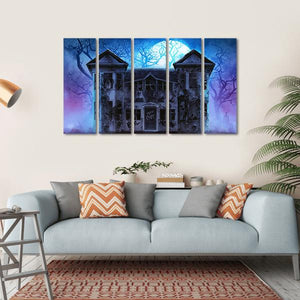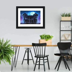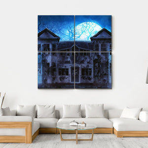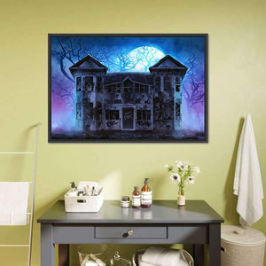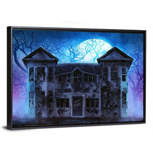 This canvas artwork features a haunted house surrounded by bare trees and a full moon. With graffiti proclaiming 'KEEP OUT' and 'EVIL' scrawled across broken windows, it sets a spooky and eerie mood that captivates. Perfect for adding a touch of gothic horror to your decor.
