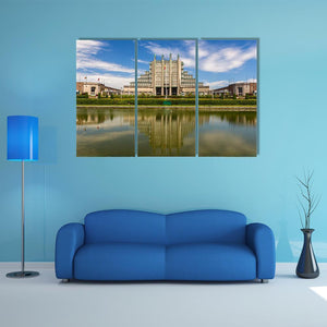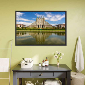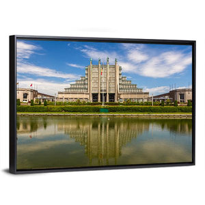 A realistic landscape showing Brussels exhibition halls and their reflection in calm water. Symmetrical composition and a bright, serene palette of blue, green, white and brown create a grand, peaceful atmosphere that fits modern living rooms and entryways.