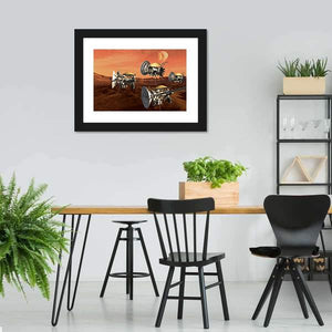 This panoramic canvas depicts multiple spacecraft probes on a rocky, reddish alien terrain with a ringed planet in the background, setting an exploratory, distant, scientific mood. The sci‑fi digital art uses orange, brown, gold and grey tones to convey scale and atmosphere. Pairs well with modern room decor and astronomy-themed spaces.