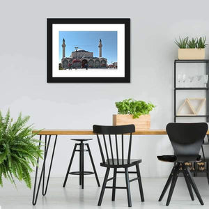 Selimiye Mosque Turkey Canvas Wall Art shows the mosque’s symmetrical façade with soaring minarets and a central dome in a realistic, peaceful scene. Rendered in blue, tan, green and white with arches, decorative patterns and small figures, it brings a serene, majestic mood that suits modern or architecture-focused rooms.