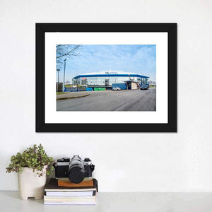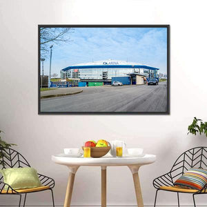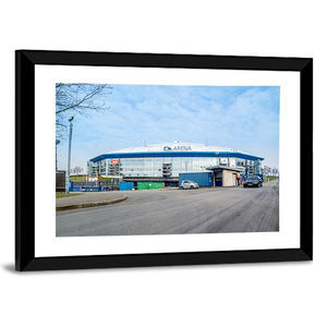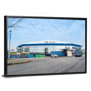 A modern cityscape canvas of Veltins Arena in Germany, showing the arena, surrounding building and parking lot from an eye-level, daytime view. Cool blues, gray and white with touches of green create a calm, urban mood; the word "Arena" is visible on the building. This canvas print suits modern living rooms and offices.