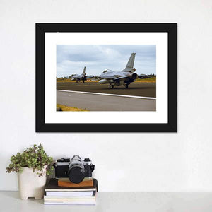 Two F-16A fighter jets on an airfield runway rendered in a realistic photographic style, with one jet closer and in sharp focus and the number J-643 visible. Muted grays, blues, whites and hints of green give the scene a powerful, dynamic, ready mood with strong perspective and depth. Works well in modern interiors or military-themed rooms as wall decor.