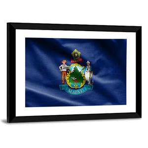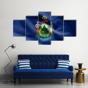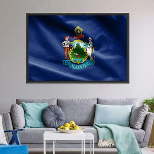 This canvas displays the Maine state flag with a centered coat of arms, showing two figures, a moose, and the words Dirigo and Maine. The graphic design and blue, green, white, and gold palette gives a patriotic, official feel that suits modern home wall decor.