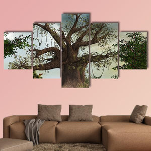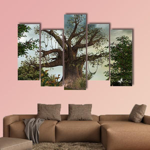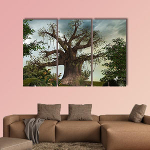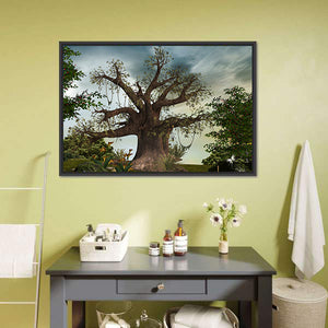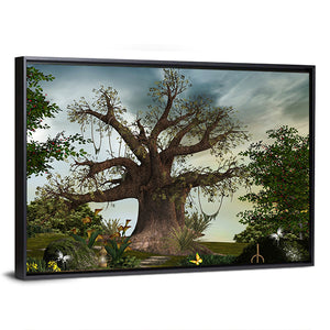 Fabulous Garden Canvas Wall Art centers on an enormous ancient tree surrounded by lush foliage, butterflies, hanging vines and a stone path that leads to the trunk. A palette of greens, browns, grays and whites with glowing plants and a dramatic cloudy sky gives the scene an enchanting, mystical, and serene mood that works well in modern or nature-inspired rooms.