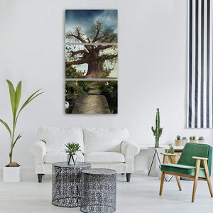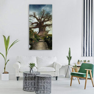 A whimsical, magical garden scene centered on a large gnarled tree and a stone path, dotted with butterflies and lush foliage. The composition uses leading lines to draw the eye along the path and creates a calm, serene atmosphere. Pairs well with modern room decor or fantasy-inspired interiors.