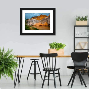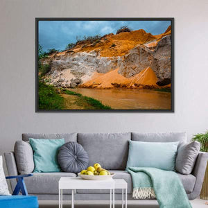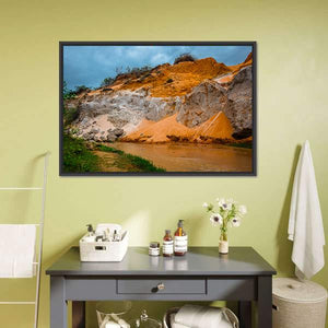 Fairy Stream, Vietnam captures layered sandstone cliffs and a winding river set against grass and a cloudy sky. The photograph balances dramatic and serene tones in an orange, brown and blue palette and works well in modern or nature-inspired rooms.
