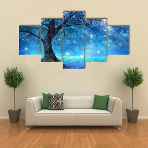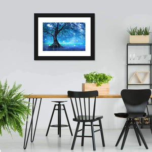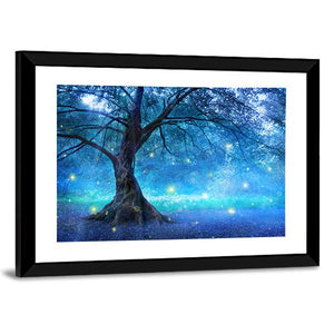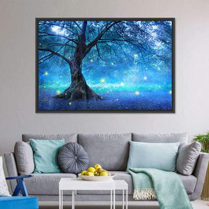 This enchanting canvas features a mystical forest scene with a gnarled tree trunk illuminated by glowing orbs. The serene palette of blue, green, and yellow evokes a magical atmosphere, perfect for adding a touch of fantasy to your home decor.