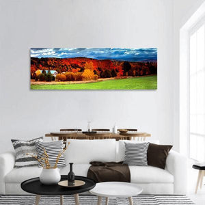 This panoramic canvas captures Vermont fall foliage with a rural house nestled among forests, rolling hills, and a green field beneath a dramatic, stormy sky. Realistic colors—reds, oranges, yellows, greens and greys—give the scene a vibrant yet peaceful mood that suits modern or rustic room decor.