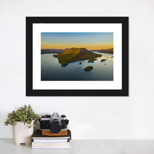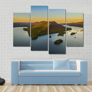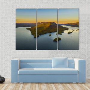 This tranquil landscape captures the serene beauty of Lake George, featuring an island framed by majestic mountains and a gentle boat gliding across the water. With a warm palette of blue, green, orange, and yellow, it brings the magic of golden hour to your space.