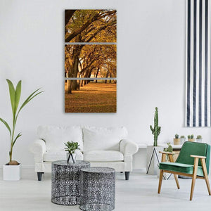 This canvas shows a tree-lined path and a park bench surrounded by yellow, orange, brown, and green autumn foliage, with sunlight filtering through the trees and fallen leaves on the ground. The photographic, realistic composition feels peaceful and warm and suits modern, nature-inspired interiors.