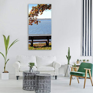 A wooden bench beside a calm lake, framed by a low tree branch and fall foliage, rendered in realistic detail. The blue, green, orange and brown palette and rule-of-thirds composition create a peaceful, autumnal scene that fits modern or nature-inspired rooms.