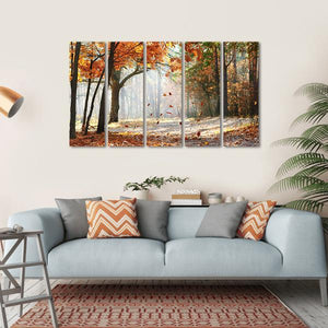 This canvas wall art captures the serene beauty of autumn in a forest. With vibrant orange, brown, and gold leaves gently falling under soft sunlight, it creates a warm and inviting atmosphere perfect for any nature lover.