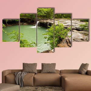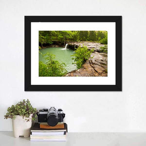 Falling Water Creek, Arkansas, captures a photorealistic view of a waterfall and clear pool framed by flat rocks and lush trees. The scene feels serene and peaceful, with greens, blues and browns that suit modern or nature-inspired rooms.