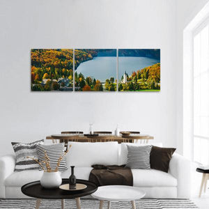 This panoramic artwork captures the tranquil beauty of Bohinj Lake, surrounded by serene forests and a quaint village. The rich colors of blue, green, and warm autumn hues invite a picturesque atmosphere, perfect for any nature-inspired décor.