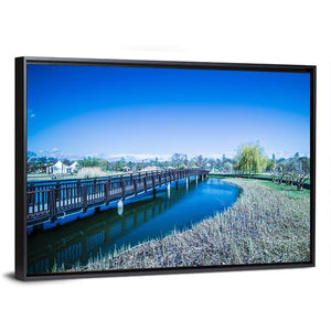 Bring the serene beauty of nature into your space with this canvas wall art featuring a tranquil scene of a wooden bridge over a peaceful canal. The calming palette of blues, browns, greens, and whites captures the essence of a famous garden in Vienna, inviting a sense of relaxation and harmony.