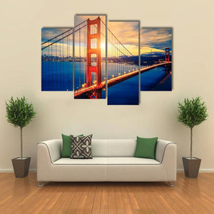 A photorealistic canvas of the Golden Gate Bridge and San Francisco skyline at sunset, rendered in warm orange and cool blue tones. Diagonal lines and bridge lights create a majestic, serene golden-hour mood that works well in modern living spaces and room decor.