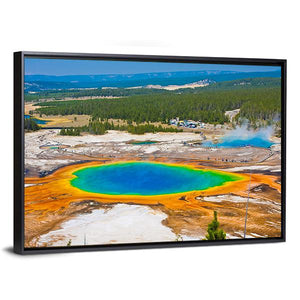 This vibrant canvas art captures the awe-inspiring Grand Prismatic Spring in Yellowstone National Park. Featuring a breathtaking aerial view of the multicolored geothermal pool surrounded by lush forests and distant mountains, it brings a natural beauty to your walls.