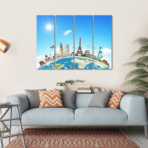Celebrate the world's iconic landmarks with this vibrant canvas art. Featuring beloved monuments like the Eiffel Tower and Statue of Liberty, it evokes an adventurous and aspirational atmosphere, perfect for travel enthusiasts.