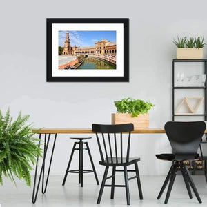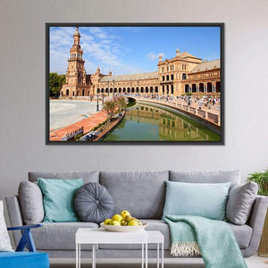 Experience serene beauty with this Plaza De Espana canvas wall art. Featuring stunning architecture, including an ornate tower and arched building facades, the artwork captures the reflective charm of the canal. Its bright palette of blue and brown adds a picturesque touch to any space.