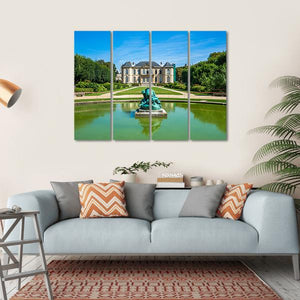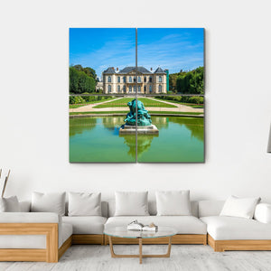 This canvas art captures a serene landscape featuring a mansion, a peaceful pond, and elegant gardens, inspired by the beauty of the Rodin Museum in France. The calming palette of greens and blues creates a tranquil atmosphere, making it a wonderful addition to any room decor.