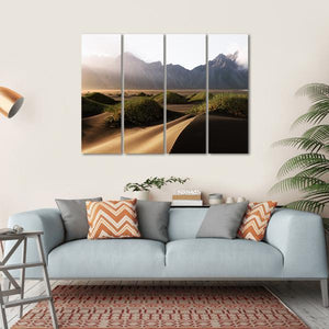 This canvas art captures the serene beauty of Vestrahorn Mountain in Iceland, featuring striking sand dunes and lush grass mounds enveloped in soft mist. The atmospheric scene conveys a sense of tranquility, making it a beautiful addition to any nature lover's decor.