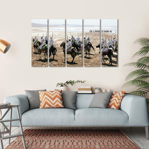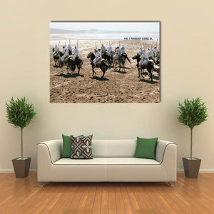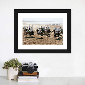 This dynamic canvas artwork features horseback riders navigating a desert landscape near Essaouira. With a palette of tan, brown, and blue, it captures a scene of action with riders in white robes and spears, set against sandy ground and distant water.