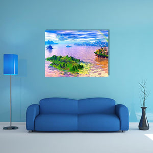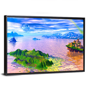 Fantastic Island Canvas Wall Art shows a surreal island scene with mountains, sea, sky and structures. Soft greens, blues, purples and pinks create a tranquil, fantastical atmosphere. The abstract, modern look suits contemporary rooms and modern décor styles.
