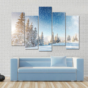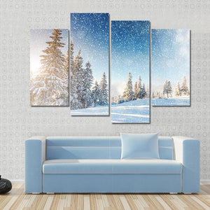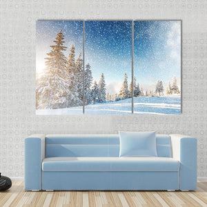 Immerse yourself in a serene winter landscape with this canvas art featuring a snowy forest scene. With sunlight filtering through the trees and delicate snowflakes falling, it captures the peaceful magic of winter.