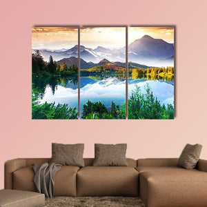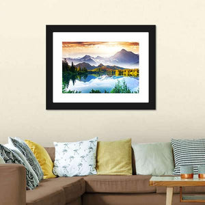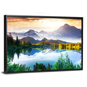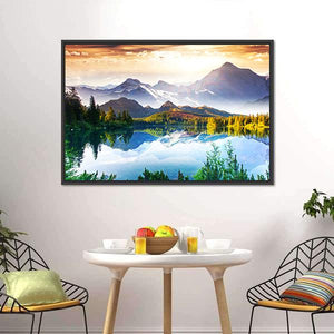 Sunny Mountain and Lake depicts snow-capped mountains, trees and a clear water reflection that create a serene, majestic scene. The realistic palette of blues, greens, whites and touches of orange gives the image depth and symmetry. It suits modern and nature-themed rooms as a calm wall focal point.