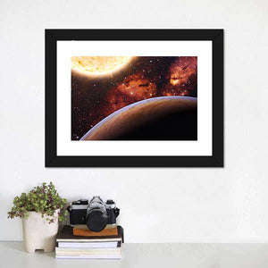 Explore a cosmic scene with this canvas wall art featuring a detailed close-up of a textured planet. A glowing sun and wispy nebula clouds create an awe-inspiring atmosphere filled with scattered stars, making it a striking addition to your space-themed decor.
