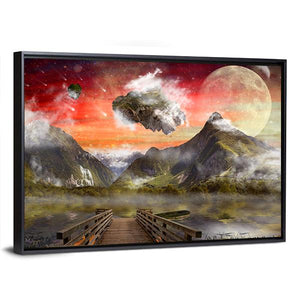 Explore a surreal landscape filled with floating islands, majestic mountains, and a shimmering waterfall. The vibrant palette of reds, oranges, and greens creates an epic and mysterious atmosphere, making it a captivating addition to your wall decor.